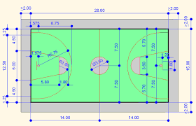 El terreno de juego (baloncesto) es una superficie rectangular, libre de obstáculos con unas dimensiones de 26 m x 14 m, medidas desde el borde interior de las líneas de demarcación. La línea de demarcación tendrán un grosor de 5 cm. El piso del campo ha de ser duro, de cemento o Parquet (madera).