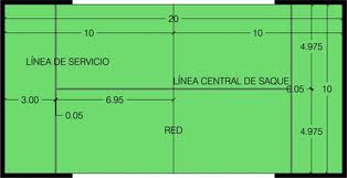 El área de juego es un rectángulo de 10 metros de ancho por 20 metros de largo (medidas interiores) con una tolerancia de 0,5%. Este rectángulo está dividido en su mitad por una red A ambos lados de ella, paralelas a la misma y a una distancia de 6,95 m están las líneas de servicio. La línea central de saque se prolongará 20 cm. más allá de la línea de servicio, todas las líneas tienen un ancho de 5 cm, pistas cubiertas la altura mínima libre hasta el techo será de 6 metros.
